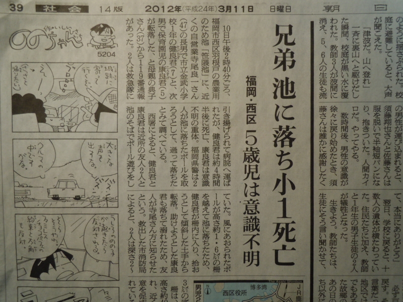 東日本大震災の1年目となる3月11日の新聞朝刊を開いたとき、「兄弟池に落ち小1死亡」という痛ましい記事を目にしました。