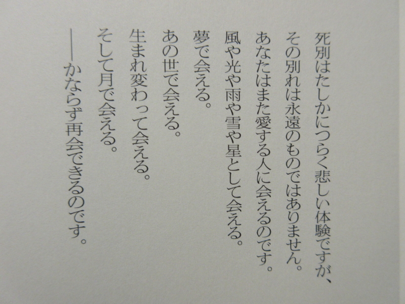 本書の帯には「『さみしさ』という深い闇の中で月あかりに導かれているような温かさを感じました。――」「愛する人を亡くしたとき、人はその悲しみ、喪失感にどう立ち向かっていけばいいのか。――死に直面した人の心に、愛という水を注ぎ込む、現代人のための心の書」