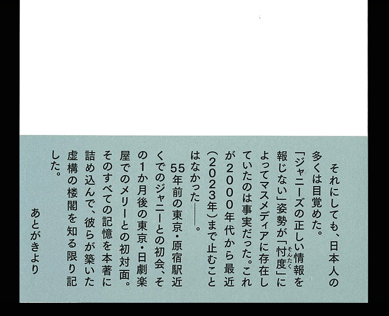 本書の帯には、「さよならジャニーズ 絶対権力者 弟ジャニーと姉メリーの『嘘』と『真相』 消せない過去の重い扉を開く!」と書かれています。帯の裏には、「それにしても、日本人の多くは目覚めた。『ジャニーズの正しい情報を報じない』姿勢が『忖度』によってマスメディアに存在していたのは事実だった。これが2000年代から最近(2023年)まで止むことはなかった――。55年前の東京・原宿駅近くでのジャニーとの初会、その1か月後の東京・日劇楽屋でのメリーとの初対面。そのすべての記憶を本著に詰め込んで、彼らが築いた虚構の楼閣を知る限り記した。 あとがきより」と書かれています。